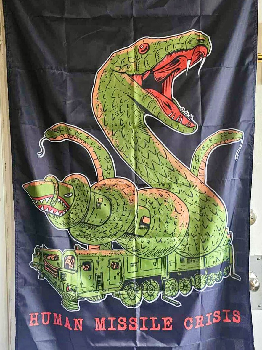 Full-color custom merch flags printed for Dartmouth Rockers Human Missle Crisis